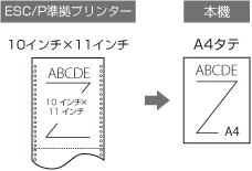 ESC/P準拠プリンターに 10 インチ × 11 インチの連続用紙をセットして使用していたときに選択します。A4サイズに縮小し、用紙のほぼ中央(ワイド領域モードでは印字領域ほぼいっぱい)にポートレイトで印刷します。