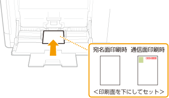ここでは、封筒をセットする前に行う準備と、封筒やはがきをセットする際の正しい向きについて説明しています。手差しトレイにセットするときの全体的な手順については、 手差しトレイにセットするを参照してください。 |