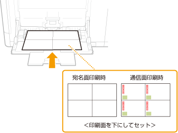 貼り合わせのない面(オモテ面)を下にして、封筒の短辺から差し込みます。なお、貼り合わせのある面(ウラ面)には印刷できません。