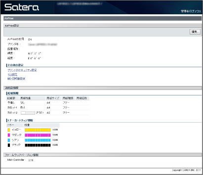 AirPrint専用ページからAirPrintの設定画面を表示したり、用紙やトナーカートリッジなどの消耗品の状態を確認したりすることができます。また、セキュリティー機能の設定(