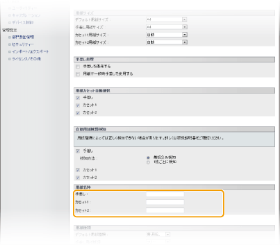 給紙部にセットした用紙の名前を付けることができます。たとえば、会社で複数のキヤノン製プリンターをお使いの場合、すべてのプリンターで特定の用紙をセットする給紙部に同じ名前を付けておきます。そうすることで、どの給紙部に目的の用紙がセットされているか確認することなく、用紙名称を指定するだけでその用紙がセットされた給紙部から印刷できます。
