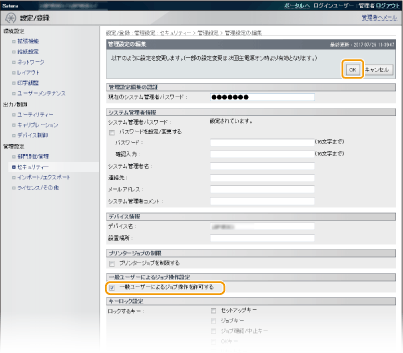リモートUIに一般ユーザーモードでログインしたときにも、文書の削除や割り込みなどの操作ができるように設定します。