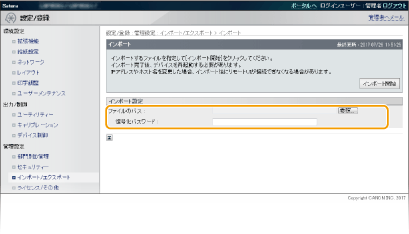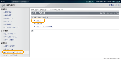 本機から書き出したデータを読み込みます(インポート)。また、同一機種間であれば、他機の各種設定値を本機で読み込むこともできます。