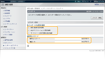 [設定/登録]から設定できる項目の設定値をエクスポートするときは、チェックマークを付けます。
