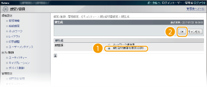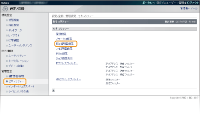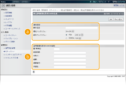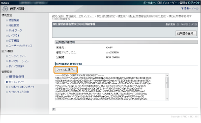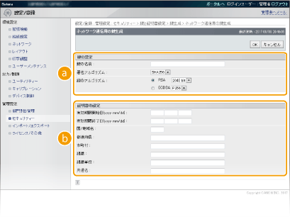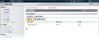 Transport Layer Security(TLS)を使った暗号化通信に必要な鍵ペアを生成できます。TLSは、リモートUIを使って本機にアクセスするときや、IPP印刷するときなどに使用できます。本機に登録できる鍵ペアはプリインストールされている鍵ペアと合わせて8つまでです。「ネットワーク通信用」に生成した鍵ペアでは自己署名証明書が使われます。「鍵と証明書署名要求(CSR)」では、本機で生成した鍵ペアに対して認証局発行の電子証明書を申請することができます。