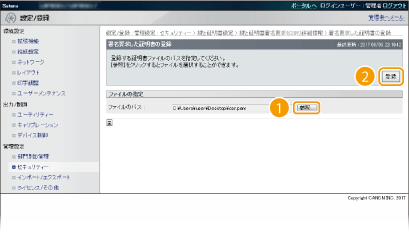 [ファイルのパス]の[参照]をクリックし、証明要求した証明書のファイルを指定したあと、[登録]をクリックする