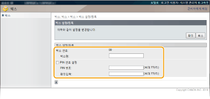 상자의 이름을 설정하거나, 상자를 여는 PIN을 설정할 수 있습니다. 상자에 쉬운 이름을 설정해두면, 프린터 드라이버를 사용하여 문서를 저장할 위치를 선택할 때 상자를 쉽게 구분할 수 있습니다. PIN을 설정하면, 제한된 사용자에 한해서만 저장된 문서를 액세스할 수 있어, 보안이 향상됩니다.