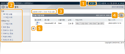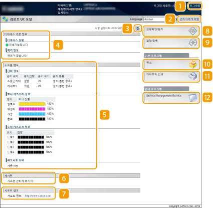 [설정/등록] 페이지의 메뉴관리자 모드로 로그온한 경우에만 [설정/등록] 페이지의 설정을 변경할 수 있습니다. 일반 사용자 모드로 로그온한 경우 [유틸리티 메뉴], [캘리브레이션], [디바이스 제어], [부문별 ID관리] 및 [가져오기/내보내기]가 표시되지 않습니다. |