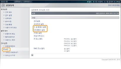 [보안]  [키 및 증명서 설정] 또는 [CA 증명서 설정]을 클릭합니다.