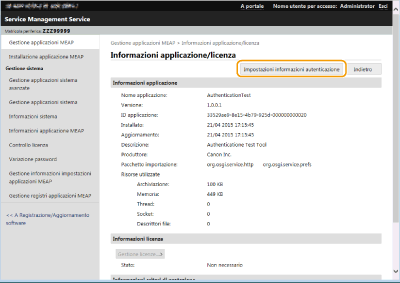 Se si fa clic sul nome di un'applicazione MEAP, saranno visualizzate le informazioni dettagliate come il nome dell'azienda e la percentuale di utilizzo della memoria per ciascuna applicazione. Da qui viene eseguita la gestione della licenza. Gestione delle licenze delle applicazioni MEAP