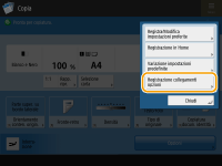 Il numero delle voci di impostazione nella schermata Funzioni di base e la posizione di visualizzazione variano in base alle funzioni. Non viene visualizzato alcun pulsante di scelta rapida se <Non assegnato> è impostato come scelta rapida. Il limite per il numero di scelte rapide per <Opzioni> registrabili è il seguente. Copia: 5 Fax: 4 Scansione e invio: 2 |