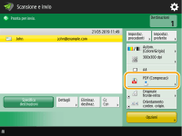 Per verificare il numero totale di destinazioni specificateIl numero totale di destinazioni specificate viene visualizzato in alto a destra della schermata. Ciò consente di verificare che il numero di destinazioni sia corretto prima dell'invio. ![]() Per annullare immediatamente un lavoro in corso di invioSe si preme (Stop) sul pannello di controllo durante l'invio di un lavoro, viene visualizzato il messaggio <Si vuole annullare il seguente lavoro di invio?>. Premere <Sì> per annullare l’invio.È possibile selezionare <Ultimo lavoro ricevuto> o <Lavoro in corso di invio> per scegliere il lavoro da annullare. <Lavoro da annullare alla pressione di Stop> Premere (Stop) in presenza di più lavori di invio per visualizzare la schermata di selezione del lavoro di invio da annullare. Se il lavoro di invio da annullare non è visualizzato, premere <Controllo altri lavori> per visualizzare <Lavori invio>. Selezionare il lavoro da annullare e premere <Annulla>.Per controllare gli stati dei documenti inviati e salvatiNella schermata <Monitor. stato>, è possibile verificare gli stati dei documenti inviati/salvati. Questa schermata consente di inviare/salvare nuovamente i documenti oppure di annullare l'invio/salvataggio dopo la verifica degli stati. Controllo di stato e registro per i documenti acquisiti Se <Visualizzazione notifica ad accettazione lavoro> è impostato su <On>, la schermata <Monitor. stato> potrebbe essere visualizzata dalla seguente schermata, visualizzata dopo la ricezione di un lavoro inviato. <Visualizzazione notifica ad accettazione lavoro> ![]() Per stampare il rapporto dei risultati di invio/salvataggioNella schermata delle funzioni di base per la scansione, se si preme <Opzioni> <Rapporto TX> è possibile impostare la stampa automatica del rapporto che elenca i risultati dell'invio/salvataggio.Per impostare per ogni lavoro da <Opzioni>, è necessario selezionare <Solo se errore> o <Off> in <Rapporto TX>, quindi impostare <Consentire stampa da Opzioni> su <On>. Nome fileQuando si invia/salva un file, il nome file viene automaticamente impostato in base al seguente formato. È possibile cambiare l'impostazione in modo da poter assegnare un altro nome. Impostazione di un nome di file Quando si invia per e-mail il formato "Numeri lavoro (quattro cifre)_numeri pagina (tre cifre).nome estensione file", ad esempio "1042_001.jpg" Quando si salva in un file server il formato "Anno, mese, giorno, ora, minuti e secondi di salvataggio del file (14 cifre).nome estensione file", ad esempio "20151030133541.jpg" Oggetto e-mailL'oggetto inserito in <Oggetto predefinito> viene impostato automaticamente (<Oggetto predefinito>). Se si specifica un oggetto diverso, modificare le impostazioni oppure specificare l'opzione ogni volta che si spedisce un'e-mail (Specifica delle impostazioni e-mail). Quando si alimentano più fogliLa scansione si arresta e viene visualizzato il messaggio sullo schermo. Seguire le istruzioni per rimuovere l'inceppamento. Dopo aver eliminato l'inceppamento, viene visualizzata la schermata di ripresa del lavoro. Se la macchina rileva erroneamente l'alimentazione di più fogli, premere <Non rilev.alim.più fogli da alimen.> per riprendere la scansione. Per impostare anticipatamente la macchina per la notifica dell'alimentazione di più fogli, eseguire una delle operazioni indicate. Ogni volta che si invia/salva, premere <Opzioni> nella schermata delle funzioni di base scansione selezionare <Rilev. alim. più fogli da alimen.> per disattivare l'impostazione.Impostare <Impost. rilev.alim. più fogli da alimentat. come default> su <Off> (<Impost. rilev.alim. più fogli da alimentat. come default>). |
