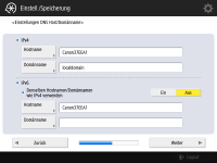 Legen Sie die DNS-Serveradresse, den DNS-Hostnamen und den DNS-Domänennamen fest. ![]() ![]() Drücken Sie <Primärer DNS-Server> und <Sekundärer DNS-Server>, geben Sie eine IPV4/IPv6-Adresse für den DNS-Server ein, und drücken Sie <Weiter>. Weitere Informationen zu den Einstellungen der DNS-Serveradresse finden Sie unter Vornehmen von DNS-Einstellungen. ![]() ![]() Drücken Sie <Hostname>, um den Namen des Geräts (Hostnamen) einzugeben. Drücken Sie <Domänname>, um den Domänennamen für das Gerät einzugeben, und drücken Sie dann <Weiter>. Wenn die Einstellungen von IPv4 und IPv6 identisch sind, drücken Sie bei <Denselben Hostnamen/Domännamen wie IPv4 verwenden> auf <Ein>. ![]() ![]() Um die Aktualisierung automatisch mit den Einstellungen für dynamische DNS-Aktualisierungen vorzunehmen, drücken Sie bei <DNS Dynamisches Update> auf <Ein> und anschließend <OK>. Wenn Sie <DNS Dynamisches Update> bei <IPv6> auf <Ein> setzen, wählen Sie <Ein>, damit die Elemente automatisch registriert werden. | |