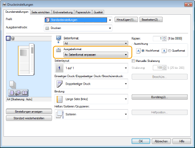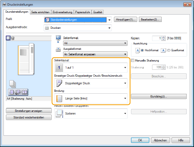 3 | Überprüfen Sie die Druckvorschau, und stellen Sie [Seitenlayout] [Seitenfolge] [Einseitiger Druck/Doppelseitiger Druck/Broschürendruck] [Bindung] ein.![]() |