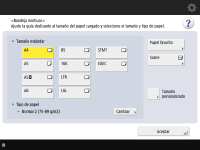 Cuando el papel se ha insertado completamente, aparece la pantalla para especificar el tamaño y el tipo de papel.
