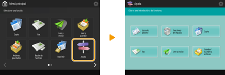 Ver la guía de funcionesPulse <Ayuda> para ver una pantalla que explica lo que puede hacer con las funciones del equipo, así como consejos de uso de la copiadora, el escáner, etc. Puede ver esta pantalla cuando desee saber más sobre las funciones disponibles y cómo utilizarlas. ![]() Ejemplo: Ayuda para funciones de copia Al seleccionar un elemento de la lista, aparece la pantalla del tutorial. ![]() Utilice la función de AyudaSegún la función que se muestra, a veces aparece en la parte superior derecha de la pantalla. Pulse para consultar la descripción y el método de funcionamiento de la función.![]() Pulse <Fin> para volver a la pantalla anterior. Utilizar del mismo modo que con un smartphone (desplazar/pellizcar/arrastrar y soltar)En algunas pantallas puede cambiar de página o deslizarse desplazando el dedo arriba/abajo o a izquierda/derecha sobre la pantalla como lo haría con un smartphone. ![]() También puede acercar o alejar la pantalla utilizando dos dedos para pellizcar hacia fuera o hacia dentro. Puede arrastrar la pantalla ampliada con el dedo. Personalización del aspecto de la pantalla y las condiciones operativas. ![]() Si <Permitir ampliación de pantalla> se ha ajustado en <Sí>, toda la pantalla se acerca o se aleja cuando se pellizca en la pantalla de vista preliminar. Si <Permitir ampliación de pantalla> se ha ajustado en <No>, solo se acercará o se alejará la imagen de vista preliminar.