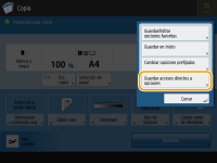 Registrar en <Opciones favoritas>En <Opciones favoritas>, puede registrar procedimientos de uso frecuente para copiar, así como destinos de uso frecuente y opciones de lectura. Para obtener más información, consulte Registrar una combinación de funciones de uso frecuente. Cambiar la configuración predeterminada de la pantalla Funciones básicasTras cambiar las opciones de cada función, puede registrar las opciones actuales como predeterminadas en la pantalla Funciones básicas pulsando seguido de <Cambiar opciones prefijadas>. Si inicia una sesión en el equipo con gestión de autenticación personal (Inicio de sesión en el equipo) antes de aplicar esta configuración, se registrará como su propia configuración predeterminada personal (Lista de elementos que se pueden personalizar). |