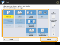 El número de opciones incluidas en la pantalla Funciones básicas y la ubicación donde aparecen varía según las funciones. No se mostrará un botón de acceso directo si <No asignado> se establece como acceso directo. El límite del número de accesos directos para <Opciones> que puede registrar es el siguiente. Copia: 5 Fax: 4 Leer y enviar: 2 |