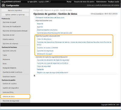 Puede seleccionar opciones concretas para importar o exportar, como listas de direcciones de la Libreta de direcciones u opciones de la impresora. Para realizar estas operaciones tiene que iniciar una sesión con privilegios de Administrador.