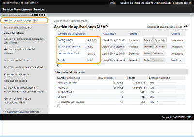 Haga clic en [Gestión de aplicaciones MEAP] y haga clic en la aplicación para gestionar la licencia.