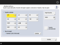 Cuando el papel se ha insertado completamente, aparece la pantalla para especificar el tamaño y el tipo de papel.
