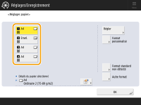 Formats de papier automatiquement détectablesSi <Personnalisé> s'affiche alors que du papier de format standard est chargé, appuyez sur <Format personnalisé>