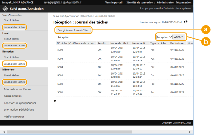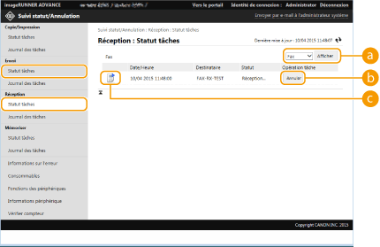 Vous pouvez vérifier les statuts des fax et des e-mails qui sont en attente pour être envoyés, des fax qui ont été reçus et des fax en attente de transmission. Vous pouvez aussi annuler le processus d'envoi et de réception des documents.