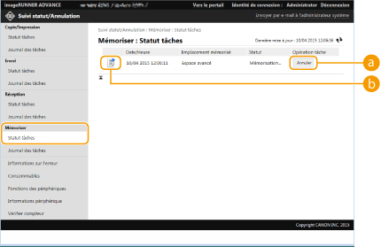 Vous pouvez vérifier les statuts des documents qui attendent d'être stockés. Vous pouvez aussi annuler le processus pour le stockage des documents.