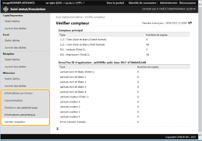 Vous pouvez vérifier diverses informations sur la machine, comme des informations d'erreur, la quantité restante de papier et d'encre, des informations sur l'équipement optionnel relié et le nombre total de pages qui ont été imprimées jusqu'à maintenant.