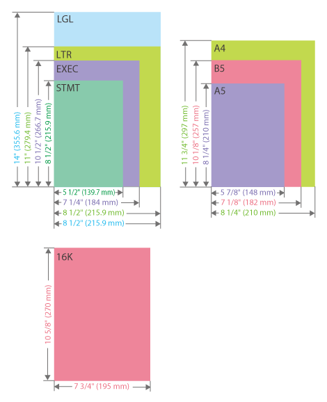 | Máquina 230 V: LGL, LTR, EXEC, A4, A5R, B5, 16K, OFICIO, OFICIO (Brasil), OFICIO (México), CARTA (Governo), LEGAL (Governo), FOOLSCAP (Austrália), FOOLSCAP/FOLIO, F4A, LEGAL (Índia) e Tamanho Personalizado (5 7/8" x 8 1/4" a 8 1/2" x 14" (148 mm x 210 mm a 216,0 mm x 355,6 mm)) |