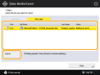 Selecione o trabalho que deseja cancelar e pressione <Cancel>.