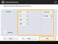 2 | Selecione o tamanho do papel. ![]() ![]() Para informações sobre os tamanhos de papel exibidos quando <Other Size> é pressionado, consulte Papel disponível |