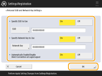 Pressione <Personal SSID and Network Key Settings>, especifique um SSID pessoal e uma chave de rede e pressione <OK>.
