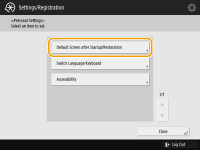 Configure a tela exibida quando a máquina é iniciadaSe a máquina estiver configurada de maneira que seja solicitado que os usuários façam login quando ela é iniciada ( Especificando quando exibir a tela de login), <Default Screen after Startup/Restoration> será exibido como um item em <Personal Settings>. A tela exibida após a máquina ser iniciada pode ser configurada para cada usuário. |