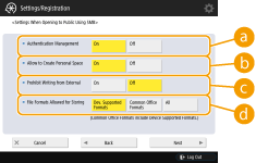 <Allow to Create Personal Space>Para criar uma pasta exclusiva para uso pessoal em Advanced Box, pressione <On>. Se <Authentication Management> não estiver definida para <On>, a configuração não será possível.