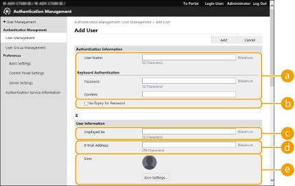 Configuring settings via the control panelYou can also register user information by pressing  (Settings/Registration)  <Management Settings>  <User Management>  <Authentication Management>  <Register/Edit Authentication User>. <Register/Edit Authentication User>Creating user groupsAddress Lists in the Address Book can be shared between users who are registered in a user group. Registering User Groups |