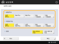 3 | IPSec을 적용할 포트를 지정합니다. IPSec을 적용할 포트를 지정할 때 포트 번호를 사용하려면 <포트 번호로 지정>를 누릅니다. IPSec을 모든 포트 번호에 적용하려면 <모든 포트>을 선택합니다. IPSec을 특정 포트 번호에 적용하려면 <단일 포트>를 누르고 포트 번호를 입력합니다. 포트를 지정한 후, <확인>을 누릅니다. 본 기기의 포트는 <로컬 포트>에 지정하고 통신 피어의 포트는 <리모트 포트>에 지정합니다. ![]() IPSec을 적용할 포트를 지정할 때 서비스 이름을 사용하려면 <서비스명으로 지정>을 누릅니다. 목록에서 서비스를 선택하고 <서비스 설정/해제>를 눌러 <설정>으로 설정한 후, <확인>을 누릅니다. ![]() | ||||||||||||||