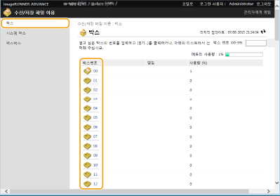 ![]() | 리모트 UI를 사용하여 메일함에 저장된 파일 및 팩스/I-팩스 받은 편지함에 임시 저장된 팩스와 I-팩스의 인쇄, 전송 또는 삭제 작업을 할 수 있습니다. |