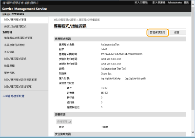 如果您按一下 MEAP 應用程式名稱,即會顯示諸如公司名稱與每個應用程式之記憶體使用量等詳細資訊。授權管理是在此頁面執行。管理 MEAP 應用程式授權