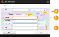 1 | 輸入傳輸資料的檔案伺服器/進階郵件信箱 主機名稱。 ![]() 詢問網路管理員關於檔案伺服器/進階郵件信箱 的資訊。 <通訊協定>從 <Windows (SMB)>、<FTP> 和 <WebDAV> 選擇檔案伺服器的通訊協定。 將文件傳送至 進階郵件信箱 時,請選擇 <Windows (SMB)> 或 <WebDAV>。 ![]() 如果選擇 <Windows (SMB)>,將會顯示 <搜尋主機> 和 <瀏覽> 按鈕。搜尋或檢視網路即可輕鬆指定檔案伺服器/進階郵件信箱。 最多可以註冊五個用於 <瀏覽> 的 Directory 伺服器。 <主機名稱>輸入檔案伺服器/進階郵件信箱 的主機名稱。 如果在通訊協定中選擇 <FTP>,請依下列說明輸入 <主機名稱>。 TLS 停用時 範例: 若要儲存至共用空間:ftp://主機名稱/share 若要儲存至個人空間:ftp://主機名稱/users TLS 啟用時 範例: 若要儲存至共用空間:ftps://主機名稱/share 若要儲存至個人空間:ftps://主機名稱/users 將文件傳送至 進階郵件信箱 時,請依下列說明輸入 <主機名稱>。 如果在通訊協定中選擇 <Windows (SMB)> 範例: 若要儲存至共用空間:\\192.168.100.50\share 若要儲存至個人空間:\\192.168.100.50\users 如果在通訊協定中選擇 <WebDAV> TLS 停用時 範例: 若要儲存至共用空間:http://<IP 位址或主機名稱> 若要儲存至個人空間:http://<IP 位址或主機名稱> TLS 啟用時 範例: 若要儲存至共用空間:https://<IP 位址或主機名稱> 若要儲存至個人空間:https://<IP 位址或主機名稱> <檢查連線>輸入主機名稱後按下此按鈕,向檔案伺服器/進階郵件信箱 確認連線。 ![]() 如果您使用個人認證管理等登入服務,必須輸入 <使用者名稱> 和 <密碼>。 |