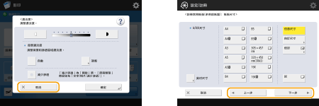 此外,取消設定並返回上一個畫面的 <取消>、套用設定並前往下一個畫面的 <下一步>、返回上一個設定畫面的 <上一步> 和關閉目前開啟畫面的 <關閉> 之類的按鈕將顯示。