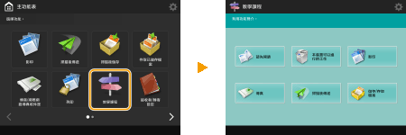 按 <教學課程> 可顯示介紹如何使用本機功能以及影印、掃描等使用提示的畫面。要瞭解可使用哪些功能以及如何使用這些功能時檢視此畫面。