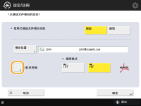 指定包括傳真接收者在內的多個接收者 從「掃描基本功能」畫面傳送包括傳真接收者在內的多個接收者,可儲存已傳送文件的副本。若要在「掃描基本功能」畫面上顯示傳真接收者,必須將 <在掃描後傳送功能中啟用傳真> 設為 <開啟>。<顯示傳真功能> |