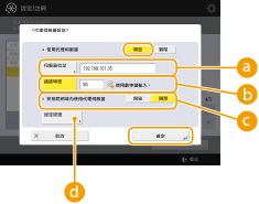 若要使用 Proxy 伺服器認證功能,請按此項並設定認證資訊。在顯示的畫面上,按 <開啟>,輸入 Proxy 伺服器認證要使用的使用者名稱和密碼,然後按 <確定>。