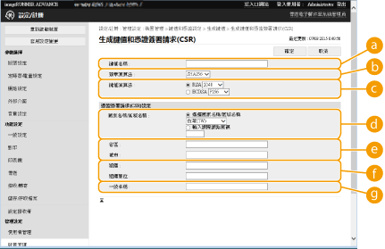 在本機上產生的憑證並沒有可能會造成某些對等通訊端通訊錯誤的 CA 簽章。若要要求 CA 簽章的憑證,將需要憑證登入要求 (CSR) 資料。使用管理員權限登入的使用者可以產生 CSR。
