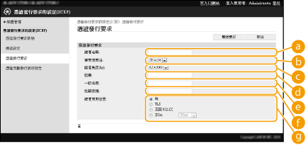 本機產生金鑰所需的憑證發行要求可傳送至管理憑證的 SCEP (簡易憑證註冊通訊協定) 伺服器。SCEP 伺服器發行的憑證會自動註冊於本機。傳送憑證發行要求需要 Administrator 權限。