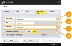 2 | 輸入使用者名稱和密碼,並進行必要的設定。 ![]() <使用者名稱>輸入在 LDAP 伺服器註冊的本機使用者名稱(範例:「user1」)。 <密碼>輸入 LDAP 伺服器上註冊的密碼。輸入密碼時,將顯示 <確認> 以供確認。再次輸入密碼。 <網域名稱>輸入本機的網域名稱。 <搜尋時顯示認證螢幕>搜尋接收者時,若要顯示使用者名稱和密碼輸入畫面,請按 <開啟>。 |