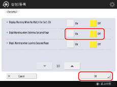 [Displ Warning when Entering Secured Page]를 [On]으로 설정하고 [Server Address to Exempt from Warning]를 설정하지 않으면 경고 메시지가 항상 표시됩니다. 다음과 같은 경우에는 경고 메시지가 표시되지 않습니다. [Server Address to Exempt from Warning]에 설정된 주소와 통신하는 경우 [Displ Warning when Entering Secured Page]가 [Off]로 설정된 경우 |