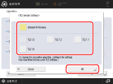 [Attempt All Versions]가 적용되는 버전은 기기의 [TLS 설정]에 있는 [사용 가능한 버전 지정]에서 지정한 범위에 따라 다릅니다. 기기의 [TLS 설정] 에 있는 [사용 가능한 버전 지정]에서 TLS 버전의 상한 및 하한을 설정할 수 있습니다. 기기의 TLS 버전 변경에 대한 자세한 내용은 “사용자 안내서”를 참조하십시오. 브라우저 엔진이 [WebKit2]로 설정된 경우 설정을 변경하면 브라우저가 재시작되고 다음 프로세스가 수행됩니다. 모델에 따라 브라우저 엔진을 변경할 수 없다는 점에 유의하십시오. 쿠키 삭제 캐시 삭제 [뒤로] 및 [앞으로] 로그 삭제 표시된 페이지가 빈 페이지로 변경 |