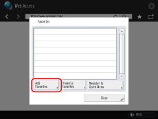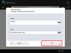 [Name] 및 [URL]이 자동으로 표시됩니다. 문자 입력에 대한 지침은 "사용자 안내서"를 참조하십시오.  을(를) 누르면 나타나는 목록에 등록된 웹 페이지가 추가됩니다. 최대 20개 북마크를 즐겨찾기에 등록할 수 있습니다. 각각의 즐겨찾기 이름 및 URL에 대해 최대 255자를 입력할 수 있습니다. |